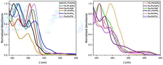 UV-vis absorption spectroscopy: The UV-visible absorption spectra of the Pt(II) and Pd(II) complexes show bands in the range from 230 nm to 450 nm (Figure 1 depicts the absorption spectra in DCM; the data in toluene are available in the Supplementary Materials, see Figure S78). According to bibliographic literature, the intense high-energy absorption bands can be assigned to spin-allowed transitions into 1LC states primarily involving the tridentate ligand [46]. In addition, the energetically lower bands between 350 nm and 450 nm are assigned to transitions involving 1MLCT and intra-ligand states [25]. However, it is noteworthy that the absorption bands are insensitive to the solvent’s polarity. This observation can be attributed to the primary LC character of the excited states, which have dipole moments resembling the ground state [47].