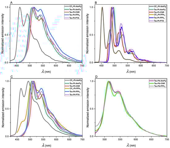 Photoluminescence emission spectra: (A) CF3-Pt-AmPy, tbu-Pt-AmPy, tbu-Pt-CNR, tbu-Pt-PPh3, and tbu-Pt-PTA in liquid DCM at RT (λexc ranges between 320 nm and 350 nm); (B) CF3-Pt-AmPy, tbu-Pt-AmPy, tbu-Pt-CNR, CF3-Pt-PPh3, tbu-Pt-PPh3, and tbu-Pt-PTA at 77 K in frozen glassy matrices (DCM/MeOH 1:1, λexc ranges between 300 nm and 355 nm); (C) CF3-Pt-AmPy, tbu-Pt-AmPy, tbu-Pt-CNR, CF3-Pt-PPh3, tbu-Pt-PPh3, and tbu-Pt-PTA in liquid toluene at RT (λexc ranges between 320 nm and 355 nm); (D) tbu-Pd-AmPy, tbu-Pd-CNR, and tbu-Pd-PPh3 in liquid toluene at RT (λexc ranges between 320 nm and 350 nm). The spectra are normalized to the highest intensity (c ≈ 1 × 10−5 M).