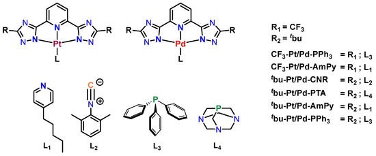 Our previous work focussed on neutral platinum(II) complexes with the N^N^N chromophoric ligand motif, as initially introduced by Strassert, De Cola et al. [25,42,43]. These photoactive chelators exhibit notable attributes, including a strong ligand field splitting that precludes a fast thermal population of dissociative metal-centered states, thereby minimizing radiationless deactivation processes. Building upon these prior findings, we herein employed two established luminescent chelators, namely 2,6-bis(3-(tert-butyl/trifluoromethyl)-1H-1,2,4-triazol-5-yl)pyridine, in combination with a broad range of ancillary ligands such as AmPy, CNR, PPh3, and PTA. This approach led to a series of isoleptic platinum(II) and palladium(II) complexes, with Pt(II) and Pd(II) centers serving as perturbative metal ions.