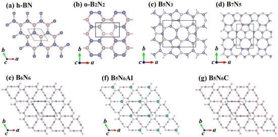 Crystal structures of the h-BN (a), o-B2N2 (b), B5N3 (c), B7N5 (d), B6N6 (e), B5N6Al (f), and B5N6C (g). Light blue, light pink, green, and light red represent boron atoms, nitrogen atoms, aluminum atoms, and carbon atoms, respectively.