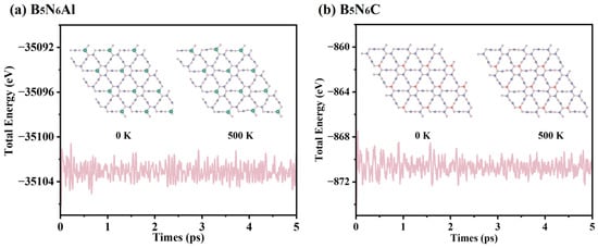 Ab initio molecular dynamic (AIMD) simulations were performed to evaluate the thermal stabilities of B5N6Al and B5N6C sheets under 500 K. The supercell of B5N6Al and B5N6C sheets before and after 5 ps simulation at a temperature of 500 K is also shown in Figure 3. The supercells of B5N6Al and B5N6C did not change significantly, and the B-N, N-Al and B-C bonds were not broken. The total energy fluctuation was also maintained at a stable level, indicating that B5N6Al and B5N6C have thermal stability at 500 K.