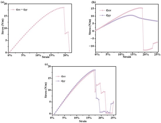 Strain–stress curves for the uniaxial tensile strains of B6N6 (a), B5N6Al (b), and B5N6C (c).