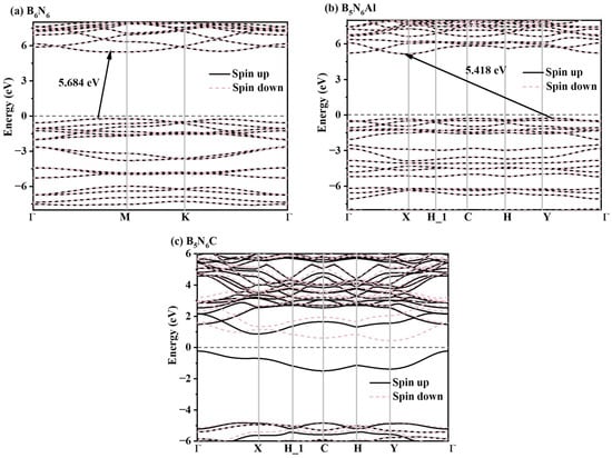 Electronic band structures of B6N6 (a), B5N6Al (b), and B5N6C (c). Black and red lines in the band structure present spin-up electrons and spin-down electrons, respectively.