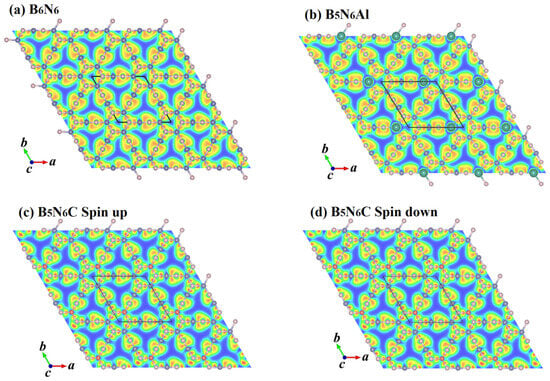 The electron localization function (ELF) of B6N6 (a), B5N6Al (b), and B5N6C (c,d).