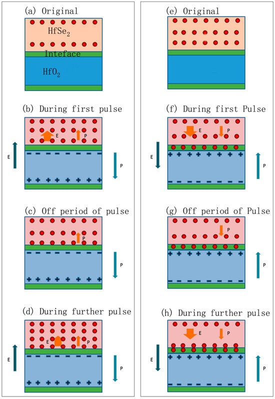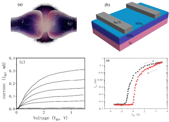 In response to this formidable challenge, researchers have turned their attention to HfO2 material, which is known for its high dielectric constant [10]. HfO2 has become a leading material in the semiconductor industry, owing to its seamless integration with silicon-based industrial processes [11,12,13]. Recent findings have revealed that extremely thin layers of HfO2 demonstrate ferroelectric properties, which has generated considerable interest due to their potential in influencing synaptic behavior [14,15,16,17]. This interest stems from the distinct response of ferroelectric materials to electrical stimuli, which opens up new avenues for application. While there are various ferroelectric materials, including perovskites [18], their incompatibility with the semiconductor industry’s standard processing methods precludes their use, especially in the fabrication of ultrathin layers, which is crucial for maintaining reliability and precision. In contrast, silicon remains a fundamental element in semiconductor technology, largely attributed to its 1.1 eV band gap enabling operations at low voltage [19]. The function of SiO2 as a high-quality and inherent insulator has played a crucial role in maintaining silicon’s dominance in the industry for over fifty years. Nevertheless, in the past ten years, there has been a transition from using SiO2 to HfO2-based high-k insulators in silicon electronics [20]. Despite the benefits of HfO2, it is not a native oxide of the silicon substrate, leading to various interface challenges and a reduction in ferroelectric effects due to inadequate polarization screening. This situation poses a compelling question: if silicon derives significant benefits from its native SiO2 insulator, could HfO2, a well-known high-k dielectric, inherently complement other semiconductors? Layered two-dimensional semiconductors, like HfSe2, are significant in this scenario due to their band gaps, which vary from 0.9 to 1.3 eV. These band gaps cover a range from thicker bulk layers to thinner monolayers. HfSe2 is considered a promising candidate for technological applications due to its compatible bandgap and its ability to work well with HfO2’s dielectric properties. To mimic the ‘SiO2/Si’ structure and explore new frontiers in semiconductor technology, a ferroelectric HfO2/HfSe2 stack has been adopted. This innovative approach potentially marks the beginning of a new era in semiconductor technology, with HfSe2 playing a crucial role in the architecture of transistors, promising advancements in both functionality and efficiency.
