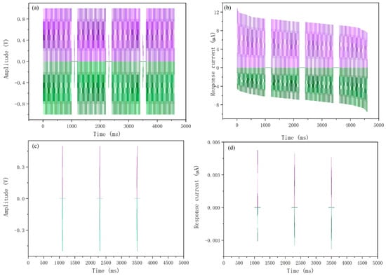 Figure 2 provides a detailed visualization of the behavioral patterns of a transistor when subjected to a carefully designed sequence of bipolar voltage pulses. Figure 2a demonstrates the intentional use of a sequential pulse train applied to the transistor’s gate. Each pulse is precisely timed with a periodicity of 20 ms, has a fixed amplitude of 1 V, and is delivered with a pulse width of 20 ms. The accurate and regular stimulus is crucial for manipulating the gate of the transistor and imitating synaptic behavior.