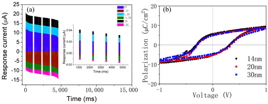 The graph depicts the potential of a neuromorphic device to exhibit synaptic plasticity, with a current response that is highly sensitive to the amplitude and temporal characteristics of voltage pulses. Pulse parameters—amplitude, duration, and periodicity—are pivotal in modulating the neuromorphic transistor’s response current. Our study focused on the amplitude’s influence while maintaining consistent pulse duration and periodicity. Incrementing the amplitude of negative/positive pulses resulted in an augmented/diminished synaptic response current (refer to Figure 3a), suggesting enhanced efficacy in the charge’s release/trapping processes. The augmentation in current under a negative pulse and its reduction under a positive pulse reflect the amplitude’s role in controlling the charge dynamics. The supplementary inset of Figure 3a presents the response current continuity post pulse train cessation, utilizing a 0.2 V reading voltage. Notably, this current persists in its incremental/decremental trend under the accumulation of negative (positive) bias voltage, reinforcing the assertion that longer intervals of pulse do not abate the synaptic response’s progressive trajectory. This observation alludes to an intrinsic polar electric field’s sustained influence, validated through P-V measurements that substantiate the ferroelectric nature of the examined HfO2 films (as shown in Figure 4b) [26]. Figure 4b illustrates the ferroelectric characteristics of HfO2 thin films at various thicknesses (14 nm, 20 nm, and 30 nm), as shown by their polarization–voltage (P-V) loops. The P-V loops indicate that the ferroelectric properties of the films are not significantly dependent on the thickness, as all three thicknesses show similar hysteresis loops, which is characteristic of ferroelectric behavior. Notably, even at a reduced thickness of 14 nm, the film exhibits distinct ferroelectricity, which is often not as pronounced in other ferroelectric materials at such thin dimensions.