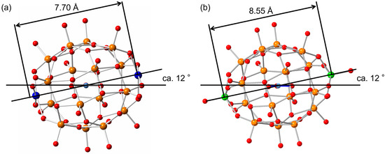 The single crystals suitable for the X-ray analysis were obtained by the cation-exchange reaction to the tetramethyl ammonium cations (Table S1). The crystal system was monoclinic, and the space group was P21/c. The unit parameter and the volume were the moderate values among the polyoxometalates. Five tetramethyl ammonium cations were observed per one anion, showing that the charge of the observed anion is 5−. The anion structure was almost the same as that of the original helical V18. The top and bottom cap parts on the helix were confirmed as copper atoms. At the axial position of one of the copper atoms, acetonitrile was solvated with a distance of 2.41 Å. At the axial position of the other side of copper atom, a terminal oxygen atom from the neighboring Cu2V16 anion interacted at a distance of 2.64 Å. These distances are too large to consider as a chemical bond. Therefore, the coordination geometry of copper atoms is considered to be pseudo-square pyramidal. The double helix part in the body of Cu2V16 was identical to that of the original V18. The N–O distances from an incorporated nitrate showed a variation of bond lengths as short and longer bonds. The N–O bond length perpendicular to the hypothetical line connecting two copper atoms was 1.144 Å, and the rest of the N–O bond lengths were 1.260 and 1.301 Å (Table 1). A similar set of bond lengths is also observed in V18 (1.090, 1.157, and 1.284 Å). The angle of the guest nitrate triangle from the line between the capped atoms of Cu2V16 was ca. 12°. This value is also the same as that of V18 (Figure 3). The distances between the capped copper atoms of Cu2V16 and vanadium atoms of V18 were 7.70 and 8.55 Å, respectively, showing that the cavity size of the spherical skeleton of Cu2V16 was smaller than that of V18 (Table 1). The bond lengths between the copper atoms and the surrounding oxygen atoms were 1.894, 1.905, 1.923, and 1.935 Å and 1.904, 1.907, 1.916, and 1.920 Å, respectively (Table 1). From the bond valence sum values of copper (2.12 and 2.13) and vanadium (4.98–5.19), the valences of copper and vanadium were identified as +2 and +5, respectively [30]. This result was also supported by the observation of the Vis/NIR spectrum (no presence of V4+) and the magnetic susceptibility (presence of two Cu2+) results.