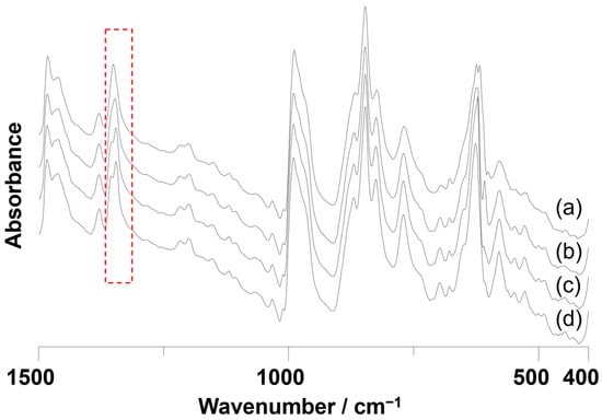 IR spectra of Cu2V16 at (a) 20 °C, (b) −60 °C, (c) −110 °C, and (d) −140 °C. The highlighted region represents the signals due to NO3− in Cu2V16.