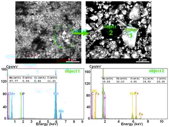 Figure 1 presents the scanning electron microscopy (SEM) images (in the electron backscatter mode) and the corresponding energy-dispersive X-ray spectrometry (EDS) analysis of the MA-Mn1.2Co0.05Fe0.7P0.45Si0.5B0.05 powder mixtures obtained after 15 h of milling. The majority of the mixing powder particles have irregular morphologies, whereas a minority have spherical morphologies. This is because of the competing impacts of fracture, cold welding, and plastic deformation. The small particles are cold-welded on the large particles’ surfaces, which may promote the growth of some particles relative to the smallest ones. The powder particles’ sizes appear to be dispersed throughout a large range (0.8–5μm). However, Si particles are more brittle and harder than Mn, Fe, and Co particles. As a result, they fracture, and the smaller particles agglomerate together to produce lamellar particles, which in turn form agglomerated particles of various sizes and forms. In addition, extreme plastic deformation makes the metallic particles brittle and increases their propensity to bond to form larger particles. The macrostructure, which is divided into two phases—the lightest (object 1) and darkest (object 2) areas—appears more distinct at high magnification. The darker portions correspond to the primary hexagonal phase of the Mn2P type, while the lighter areas reflect the alpha-Mn-rich phase indicated by the impurity Mn3Fe2Si3 (found by X-ray diffraction (XRD)). The depiction is shown without the peaks corresponding to the Co and B elements because the EDS resolution was insufficient to detect such low content of Co and B (0.05 at%).