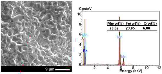 Figure 2 illustrates the SEM image and the corresponding EDS analysis of the MA-Mn1.2Co0.05Fe0.7P0.45Si0.5B0.05 powder mixtures obtained after 15 h of milling, followed by annealing with two heating cycles (at 1373 K for 2 h and again at 1073 K for 24 h). The SEM image reveals that the microstructure is composed of granules of round and elongated shapes with lenticular interfaces. This microstructure is explained by its adaptation to the large strain energy induced by the significant lattice distortions between the paramagnetic and ferromagnetic phases [20].