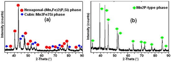 Recent years have seen a significant increase in interest in near-room-temperature magnetic refrigeration due to its many benefits, including great efficiency and minimal environmental effects [1,2,3]. The effectiveness of this technique is significantly enhanced by the performance of materials with a giant magnetocaloric effect (GMCE). A first-order magnetic transformation (FOMT) frequently occurs in these advanced magnetocaloric materials [1,2,4]. Giant magnetocaloric materials having a first-order magnetoelastic transition (FOMET) have been recently referred to as the hcp-Fe2P-type phase (space group (SG): P-26 m), and the majority of research has been conducted on (Mn, Fe)2(P, As, Ge) materials [1,2,5,6,7]. However, these materials cannot be employed in functional refrigeration systems due to the availability of Ge and the toxicity of As. Substituting As and Ge for Si is one of the most well-known strategies employed to create an ambient-temperature magnetic refrigerant with outstanding performance. Due to their GMCE performance, low economic expenses, and absence of hazardous components, (Mn, Fe)2(P, Si)-based alloys have garnered significant research attention and are the most promising giant magnetocaloric materials (GMCMs) when compared to the previous two-generation (Mn, Fe)2(P, As) and (Mn, Fe)2(P, Ge)-based composites [8,9]. MnMX alloys (where M = Co or Ni and X = Si or Ge) have typically been the focus of extensive investigation because of the reliance on magnetic and structural degree behaviors [10,11,12]. During the cooling process, the structural transition of stoichiometric MnMX compounds occurs from a martensitic-like hexagonal Ni2In structure to an orthorhombic TiNiSi structure [13]. The primary issue with MnMX compounds is that the transformation between two paramagnetic states occurs at a temperature that is typically much higher than the magnetic-ordering temperatures of both the hexagonal (paramagnetic) and orthorhombic (ferromagnetic) phases. This leads to low magnetization and a low magnetic-field-driving capacity [13,14]. A significant amount of GMCMs is produced by the magnetic-field-induced magneto-structural transformation (MST) from the hexagonal to the orthorhombic phases because of the large magnetization difference between the two phases [14]. Potential applications utilizing magneto-responsive effects require an MnMX compound type with MST that has a large Curie temperature domain and low magnetization. MnNiSi, an example of the MnMX family, possesses a considerably large Curie temperature domain with a high Curie temperature (TC) of 622 K [15]. Furthermore, from the perspective of application, the (Mn, Fe)2(P, Si)-based materials must have a continuously variable temperature change (TC) close to the working temperature and very small thermal hysteresis, which must be at least smaller than their adiabatic temperature change. Since the (Mn, Fe)2(P, Si) system was discovered, numerous attempts have been made to achieve high TC and small thermal hysteresis while maintaining the GMCE. These attempts have included changing the Mn/Fe and/or P/Si ratio [16], substituting Mn and Fe with other transition metals and rare earths [17], and replacing P or Si with B [9,18]. Without sacrificing the GMCE, it has been discovered that boron substitution improves the mechanical stability and significantly reduces the thermal hysteresis [18,19].