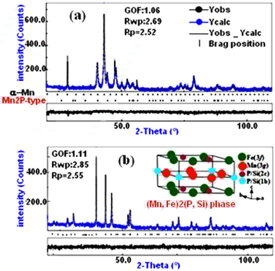Figure 4 shows the Rietveld refinement of the XRD patterns for the two synthesized powders: that of the powder milled for 15 h and that of the same powder ground and then annealed according to the two treatments with two heating cycles (at 1373 K for 2 h and then at 1073 K for 24 h). The Rietveld refinement reveals, for the MA powder, the formation of alpha Mn-type and hexagonal Mn2P-type phases. After annealing the same powder at 1373 K for 2 h and then at 1073 K for 24 h, the refined phase is the unique (Mn, Fe)2(P, Si) type with a hexagonal structure. This structure has been described by Miao et al. [24] and is given in the inset of Figure 4b. The Mn atoms (red) preferentially occupy the pyramidal coordinated 3g sites with five nonmetals as the nearest neighbors, while the Fe atoms (blue) favor the tetragonal coordinated 3f sites surrounded by four nonmetal coordination atoms and the P/Si atoms are randomly distributed on the 2c and 1b sites.
