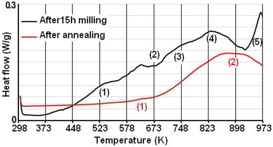 Figure 5 shows the differential scanning calorimetry (DSC) curve of the MA Mn1.2Co0.05Fe0.7P0.45Si0.5B0.05 powders obtained after 15 h of milling and after annealing with two heating cycles. For the milled sample, several overlapping exothermic peaks, spread over the whole temperature range from 373 to 923 K, are revealed. The first exothermic peak at 536 K (labeled (1)) can be related to FOMT [23]. The corresponding heat release was calculated to be around 11 J/g. An endothermic peak (labeled (2)) occurs in the temperature range of 648–698 K, which can be ascribed to the Curie temperature of the Mn1.2Co0.05Fe0.7P0.45Si0.5B0.05 powder. The extracted Curie temperature is around 675 K. It should be noted that this Tc value is higher than that measured for Mn2RuxGa (625 K) [29] and lower than that measured for Mn2Fe0.73Ga (695 K) [30] thin films. The highest value of TC was also found by Levin et al. [31] for MnCoP alloy (578 K). Indeed, the doping of the alloy by boron leads to a strong increase in TC [9,18]. This peak is followed by a shoulder (labeled (3)) that spreads out in the temperature range of 698–773 K. It can be linked to the disappearance of the important volume fraction of structural defects, mainly dislocation defects. The high-intensity peak at 843 K (labeled (4)) might be due to long-range ordering. The recovery in terms of dislocation annihilation and reordering are related processes that may occur simultaneously. The peak noted (5) may be due to the beginning of obtaining the pure hexagonal phase of the Mn2P type after the disappearance of the cubic impurity Mn3Fe2Si. In the same context, Singh et al. [32] studied, by XRD analysis, the effect of heat treatment on the phase purity of Fe2P powder synthesized by ball milling. They noticed the complete disappearance of the tetragonal Fe3P-type phase impurity after annealing at 1123 K/24 h and they consequently obtained a unique hexagonal-type Fe2P phase.