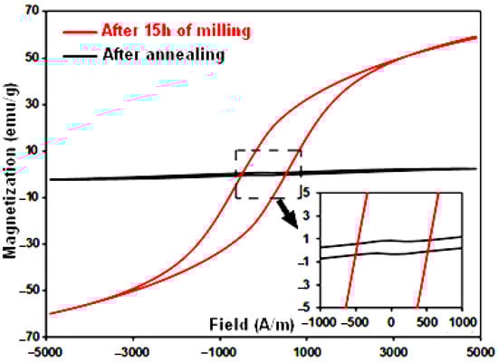 Figure 6 presents the magnetic hysteresis curves, measured at room temperature, of the Mn1.2Co0.05Fe0.7P0.45Si0.5B0.05 powders obtained after 15 h milling and after annealing with two heating cycles at 1373 K for 2 h and then at 1073 K for 24 h. A sigmoidal form with little loss is revealed by the hysteresis loop in the case of the milled powder, demonstrating ferromagnetic activity and the behavior of nanostructured materials with tiny magnetic domains [33]. With the support of nanocrystalline ferromagnetic materials, a variety of phenomena, including soft (magnetic coercivity (Hc) < 12.56 Oe), hard (Hc > 12.56 Oe) [34], and superparamagnetic (Hc~0 Oe) [35] behaviors, have been advantageously produced. According to the current investigation, the mechanically alloyed Mn1.2Co0.05Fe0.7P0.45Si0.5B0.05 alloy has an excellent soft ferromagnetic feature after 15 h, as indicated by the calculated Hc value of 7.36 Oe. The requirement for extremely low hysteresis losses was stated by Nowroozi et al. [36] for soft magnetic materials. According to our research, this Hc value is lower than those found in other published studies, which include 45 Oe for CoCrFeNiCuAl high-entropy alloy (HEA) [37], 175.68 Oe for CoCrFeNiMn HEA [38], and 30.23 Oe for (Al19Co20Fe20Ni41)100−xBx HEA [36]. In addition, the estimated values for the saturated magnetization (Ms) and remanence ratio (Mr/Ms) are as follows: 2.65% (1.27 for (Al19Co20Fe20Ni41)100−xBx HEA [39], 2.95 for CoCrFeNiMn HEA [40], and 5.98% for CoCrFeNiCuAl HEA [38]) and 7.36 Oe (30.23 for (Al19Co20Fe20Ni41)100−xBx HEA [39], 175.68 Oe for CoCrFeNiMn HEA [40], and 45 Oe for CoCrFeNiCuAl HEA [38]), respectively. Further research on the magnetic characteristics of CoCrCuFeNiTix alloys by Zhang et al. [41] revealed saturation magnetization lower than 2 emu/g. When compared to the magnetic properties of HEAs found in the existing literature [38,39,40], the current MnCoFePSiB HEA has similar values for low Hc, Ms, and Mr/Ms. Notably, good soft magnetic performance was achieved with high Ms and low Hc values. The current outcome shows that the as-milled powder has an excellent soft magnetic characteristic and can be used as a soft magnetic material. The investigation by Feng et al. [39] indicates that element B is beneficial to the use of alloys as soft magnetic materials.
