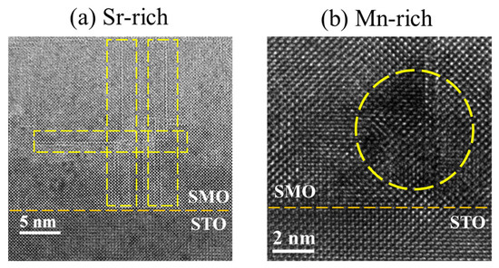 The lattice expansion implied by the XRD peak shifts of non-stoichiometric SMO films was then investigated through a comprehensive microstructural analysis using high-resolution transmission electron microscopy (TEM). It can be observed that numerous line dislocations in horizontal or vertical directions occurred in the Sr-rich SMO film (Figure 2a). These horizontal or vertical dislocations may originate from excess Sr-site ions. Since the formation energy of Mn-site vacancies is higher, excess Sr-site ions prefer to be incorporated by binding with O ions, forming SrO rock salt planes, namely Ruddlesden–Popper (R-P) stacking faults, which is consistent with related reports on A-site-rich perovskite oxides [32,35]. During the initial stages of thin film growth, SrO R-P stacking faults tend to grow in the vertical direction, because the large lattice size of SrO R-P stacking faults can compensate for the in-plane lattice mismatch between SMO films and STO substrates and, therefore, relax tensile strain. Following that, the horizontal SrO R-P stacking faults begin to form. Undoubtedly, either horizontal or vertical SrO R-P stacking faults can result in lattice expansion in Sr-rich SMO films. In addition, it can be inferred that the appearance of SrO R-P stacking faults consumes O ions too much for binding with rich Sr ions, which brings about more oxygen deficiency in perovskite SMO lattices and produces a higher density of OVs. The generation of excess OVs further aggravates lattice expansion. Figure 2b shows the clear TEM image contrast in the Mn-rich film. Generally, perovskite oxides with excess B-site elements existing during growth tend to exhibit a propensity for the formation of A-site vacancies [36]. This may be interpreted as the formation of Sr vacancies (VSrs) and accompanying large-scale disordered structural defects. The accumulation of Sr vacancies expands the lattice locally with the help of Coulomb repulsion and results in large-scale disordered structural defects [32,37]. Similar phenomena have also been reported in Ti-rich SrTiO3 films. Tsuyoshi et al. propose that the preferential formation of Sr vacancies is the most plausible scenario in cases of excess B-site Ti, as the generation of interstitial Ti contradicts the principle of energy minimization and the formation of Sr vacancies conductive to the stabilization of such B-site-rich perovskite oxides systems [32]. Tokuda et al. found that an excess of B-site elements leads to a decrease in the intensity and an increase in the width of the characteristic peaks of the O-K electronic energy loss near-edge structure in SrTiO3, confirming that VSr are introduced into SrTiO3 thin film containing an excess of Ti and form clusters [36]. Therefore, Sr vacancy clusters and large-scale disordered structural defects may lead to lattice expansion in Mn-rich SMO films, which is consistent with earlier reports [38].