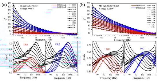 Frequency dependence of ε’ and tanδ in (a) Sr-rich SMO/NSTO film and (b) Mn-rich SMO/NSTO film at various temperatures. Colored lines are the fitting curves of the Cole–Cole function.