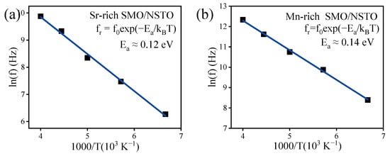 where fr is the relaxation frequency, Ea is the activation energy, f0 is the factor, and kB is the Boltzmann constant [48,49]. The ln (fr)−1000/T curves corresponding to non-stoichiometric SMO films were extracted in the frequency–dielectric spectrum, and a linear fitting was performed. The activation energy of the Sr-rich SMO film was ~0.12 eV, while that of the Mn-rich SMO film was ~0.14 eV (Figure 6), which closely resembles the relaxation activation energy associated with the Jahn–Teller (JT) polaron hopping related to Mn3+ ions in manganese oxide systems, as has been reported [51,52,53]. The JT polaron in manganese compounds is commonly associated with the Jahn–Teller distortion often observed in the Mn3+-O octahedron. Due to Jahn–Teller distortion, the decrease in crystal symmetry leads to the degeneration of electron orbitals and a reduction in the energy of electron-occupied states. The electron–phonon coupling at this stage is induced by the Coulomb effect of lattice vibrations on the eg orbital electrons, which are captured by Jahn–Teller distortion. The captured electrons and Jahn–Teller distortion collectively consist of the JT polaron, which exhibits a short-range hopping behavior akin to the reorientation motion of electrical dipoles in an applied AC electric field. When the frequency of the increased AC electric field approaches or exceeds the hopping frequency of the JT polaron, the hopping motion of the JT polaron fails to follow the field, resulting in a dielectric relaxation [54]. During this process, the contribution of JT polaron short-range hopping to dielectric properties becomes weak, resulting in a gradual reduction in the dielectric constant. Because of the fact that the interaction between the reorientation dipoles (namely, JT polaron short-range hopping here) and the surrounding medium is dynamically frictional in nature, dielectric relaxation is accompanied by an energy dissipation process and can be observed in the peaks in the dielectric loss. As usual, SMO contains only Mn4+ ions. However, positively charged oxygen vacancies, which cannot be unavoidable in oxide SMO, can induce the transition from Mn4+ to Mn3+ ions to maintain the electrical neutrality of the system. X-ray photoelectron spectroscopy investigation [33] and the weak ferromagnetic phase induced by the Mn3+-O-Mn4+ double exchange of the SMO thin films [12] provide the evidence for the rationality behind the existence of Mn3+-related JT polarons. The origin of DR2 can be attributed to the short-range hopping motion of the JT polaron. According to the aforementioned defect analysis, excess Sr ions in Sr-rich film prefer to be incorporated by binding with O ions because of the low formation energy of Sr-O; therefore, horizontal or vertical SrO R-P stacking faults appear. The formation of SrO R-P stacking faults undoubtedly consumes O ions excessively, resulting in the generation of additional oxygen vacancies in SMO lattices. More oxygen vacancies would bring about more Mn3+-related JT polarons. Therefore, Jahn–Teller polaron hopping-induced dielectric relaxation in Sr-rich SMO films is more pronounced at a low frequency, which leads to increases in the dielectric constant and loss. In the Mn-rich SMO film, the hopping path of JT polarons was limited by large-scale disordered structural defects and Sr vacancy clusters, resulting in a certain inhibition of dielectric relaxation at the low frequency [32]. Consequently, there was a decrease observed in both the dielectric constant and dielectric loss of the film. This is the reason why the Mn-rich film had a relatively small dielectric constant and loss compared to the Sr-rich SMO, as can be observed in Figure 4.
