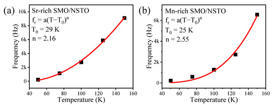 The fr–T curves of DR1 in (a) Sr-rich SMO/NSTO film and (b) Mn-rich SMO/NSTO film are fit using the critical power law, respectively.
