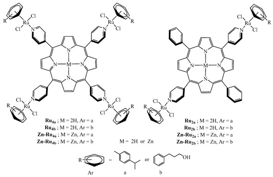 The photosensitizers (PSs) investigated in this study are arene ruthenium porphyrin derivatives, as presented in Figure 1. The complexes are prepared according to published methods [16], following the same strategy: the dinuclear arene ruthenium complexes [Ru(arene)(µ-Cl)Cl]2 (arene = p-cymene = a, arene = phenylpropanol = b) react with the pyridyl-containing porphyrin derivatives (5,10,15,20-tetra(4-pyridyl)porphyrin, 5,10,15,20-tetra(4-pyridyl)porphyrin-Zn, 5,15-di(4-pyridyl)-10,20-diphenylporphyrin, and 5,15-di(4-pyridyl)-10,20-diphenylporphyrin-Zn) to give in excellent yield the corresponding di- and tetranuclear complexes (Ru2a, Ru2b, Zn-Ru2a, Zn-Ru2b, Ru4a, Ru4b, Zn-Ru4a, Zn-Ru4b). These compounds are soluble in DMSO and slightly soluble in other solvents such as chloroform, water, benzene, ace-tonitrile, dichloromethane, acetone, and ethanol.