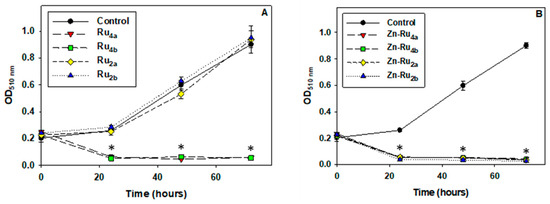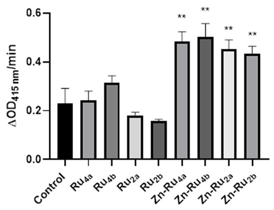 The results shown in Figure 2 demonstrate that the Zn-containing derivatives were more efficient generators of ROS than the metal-free porphyrin derivatives. The highest amount of ROS production was observed for the tetra-substituted derivatives Zn-Ru4b and Zn-Ru4a, followed by the Zn-Ru2 derivatives (Zn-Ru2a and Zn-Ru2b). The introduction of zinc increases the triplet lifetimes of the PSs, which in turn increases the chances for collision with other molecules and energy transfer to oxygen leading to the production of singlet oxygen or electron transfer, resulting in the generation of radicals [14,15]. Among the Zn-free derivatives, the tetra-substituted Ru4a and Ru4b were slightly more efficient generators of ROS than the di-substituted compounds Ru2a and Ru2b.