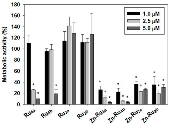 The MTT assay is commonly used to determine cell viability. Since MTT reduction to colored formazan is enzymatic and depends on availability of NAD(P)H, it reflects cellular metabolic activity. In the current study, the MTT assay was used to obtain information about the effect of photodynamic treatment on the overall metabolic activity. Figure 3 shows that the efficacy of the tested PSs in suppressing cancer cell’s metabolism parallels ROS production. The tetra-substituted Zn-chelated Ru-porphyrins, Zn-Ru4b and Zn-Ru4a were the most efficient in all tested concentrations, followed by the di-substituted Zn-Ru2a and Zn-Ru2b. Among the Zn-free derivatives, again, the tetra-substituted Ru4b and Ru4a demonstrated higher PDT activity than the corresponding di-substituted Ru2a and Ru2b. This effect was entirely light-dependent and, at concentrations of up to 5 µM, none of the tested compounds showed dark toxicity, as shown in Figure S2.