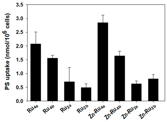 Cellular accumulation of PSs depends mainly on the structure of the compounds. Lipophilicity, number, and position of charges, symmetry, and flexibility of the molecule are among the key features that control uptake and subcellular distribution of PSs [30,32,33]. Figure 5 shows that two of the tetra-substituted derivatives, Zn-Ru4a and Ru4a, accumulate to the highest level in cancer cells. The other tetra-substituted compounds, Zn-Ru4b and Ru4b, reach intracellular level about half of Zn-Ru4a. The di-substituted Zn-Ru2a and Zn-Ru2b were taken up less efficiently and their cellular concentration did not exceed a quarter of the level of Zn-Ru4a. The presence of arene ruthenium units at the periphery of the porphyrin plays a role in increasing water solubility, presumably by aquation of the chlorido ligands, thus potentially increasing the internalization of the compound within cancer cells [36]. Cellular uptakes of the di-substituted Zn-free RuPs, Ru2a and Ru2b, were the lowest. Such low cellular uptake, combined with low ROS production, can explain the lack of photodynamic activity of these two compounds. Despite equal cellular uptake, Zn-Ru4a and Ru4a differed with respect to PDT efficiency, which can be attributed to differences in the production of ROS. Uptake of Zn-Ru2a and Zn-Ru2b was relatively low but, at 5 µM, both compounds acted as efficient PSs as a consequence of their high ROS-generating capacity, as shown in Figure 3 and Figure 4. In parallel, cellular uptake of the RuPs was measured spectrophotometrically by determining the area under the peak of the Soret band (Figure S3). Due to the low water solubility of the tested compounds, leading to partial aggregation [15], the area under the peaks was very small, which negatively affected the reproducibility of the results. Another important aspect that should be taken into consideration is that most PSs can work by both electron-transfer (Type I) and energy-transfer (Type II) photochemical reactions, and the relative contribution of each of the two mechanisms is strongly affected by the biological environment [31].