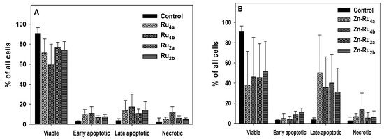 The compounds investigated in this study differ broadly by ROS yield, cellular uptake, and photo-dynamic efficiency, and it is expected that they might kill cancer cells by different mechanisms. The results presented in Figure 6 and Figure S5 demonstrate that cells illuminated in the presence of Zn-Ru were in a late apoptotic phase. No conclusion about the mechanism of cell death by Zn-free ligands could be drawn due to the low percentage of non-viable cells. The results presented in Figure S6 show a small number of necrotic and apoptotic cells when incubated with the tested compounds in the absence of light.