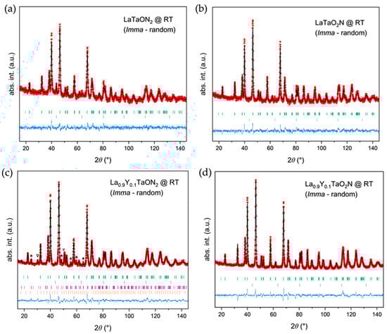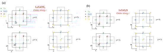 For both compositions, LaTaON2 and LaTaO2N, at 10 K, the addition of in-phase rotation of the octahedra in the perovskite-type structure along the b-axis brought a good fit, as depicted in Figure 5a,b.