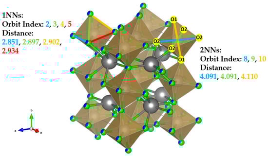 To shed light on the experimental findings, we performed theoretical investigations combining DFT calculations, CE modelling, and Monte Carlo simulations. Focusing on the experimental crystal structures of LaTaON2, a set of 300 configurations was generated, featuring randomly distributed O/N atoms within a 40-atom supercell. These configurations were uniquely crafted to ensure energetic distinctiveness, eliminating the possibility of symmetrical equivalence between any two randomly created configurations. Figure 2 depicts the Imma crystal structure of LaTaON2, where orbit indices 2, 3, 4, and 5 represent the possible first-nearest-neighbor (1NNs) configurations of N–N, N–O, and O–O; while orbit indices 8, 9, and 10 represent the possible second-nearest-neighbor (2NNs) configurations of N–N, N–O, and O–O. The experimental lattice parameters were aexp = 5.701 Å, bexp = 8.041 Å, and cexp = 5.736 Å and the calculated lattice parameters were identical, except for ccalc = 5.707 Å.
