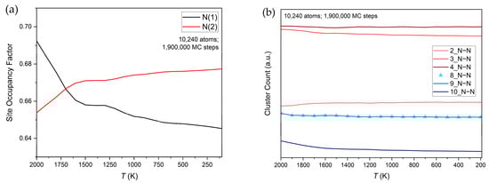 (a) The N site occupancy factors at two non-equivalent sites at different temperatures; (b) numbers of specific two-body clusters of Imma LaTaON2 at different temperatures.