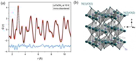 The best fit in LaTaON2 at 10 K for the average structure (space group: Imma) with a disordered model can be seen in Figure 4a.