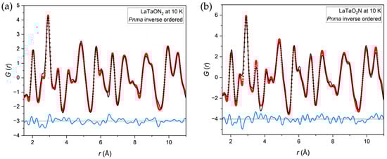 PDF pattern fits of (a) LaTaON2 at 10 K and (b) LaTaO2N at 10 K, in the 1.5 Å ≤ r ≤ 11 Å range, obtained after the addition of in-phase rotation of the octahedra along the b-axis, leading to the space group Pnma and inverse-ordered models. The red dots represent experimental data, the black line the calculated pattern, the blue line the difference curve, and the gray line is the offset zero line of the difference curve as serves as a guide to the eye.