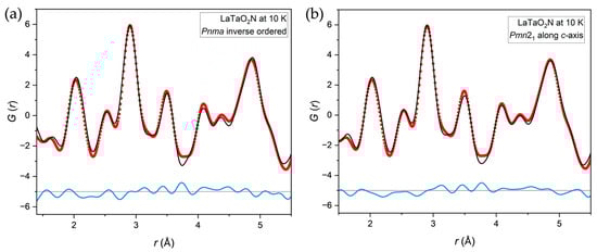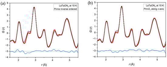 PDF pattern fits of (a) LaTaO2N at 10 K, with in-phase rotation of the octahedra along the b-axis, space group Pnma, and an inverse-ordered model, and (b) LaTaO2N at 10 K, with the addition of local O/N ordering along the c-axis and space group Pmn21. Both were in a 1.5 Å ≤ r ≤ 5.5 Å range. The red dots represent experimental data, the black line the calculated pattern, the blue line the difference curve, and the gray line is the offset zero line of the difference curve as serves as a guide to the eye.