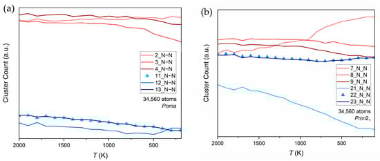 (a) Numbers of specific two-body clusters of Pnma LaTaON2 at different temperatures and (b) numbers of specific two-body clusters of Pmn21 LaTaON2 at different temperatures.