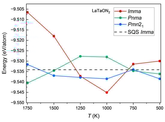 The structurally relaxed SQoS energies of space groups Imma, Pnma, and Pmn21 of LaTaON2, which are temperature-dependent, are represented in Figure 10, and simulate representative structures characterized by a short-range order. As a reference, the special quasi-random (SQS) Imma supercell structure, depicted in a black dashed line in Figure 10, simulates a configurationally fully disordered system. The fundamental idea consisted of identifying a specific configuration within a given supercell, wherein the component atoms were distributed as randomly as possible. The SQS is temperature-independent. The energy comparison revealed that the ordered Imma structure had a significantly higher energy (~30 meV) compared to the SQS Imma supercell structure at T = 1750 K, indicating that the disordered Imma structure (represented by the SQS) is favored at very high temperatures, as observed in Figure 10. The energies of the SQoS Pnma and Pmn21 structures are comparable to the disorder energy. As the temperature decreased towards 1000 K, the SQoS structure of Imma became progressively more stable. Overall, the three phases coexist at low temperatures and the energy difference (~30 meV) was of the same magnitude as the thermal fluctuation. At the synthesis temperature, T = 1275 K, the energies of all SQoS structures were comparable to the energy of the Imma disordered structure. This suggests no clear preference for either structure.