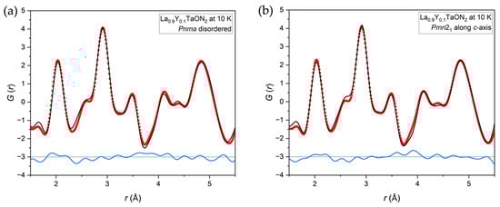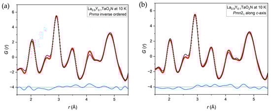 PDF pattern fits of (a) La0.9Y0.1TaO2N at 10 K, with in-phase rotation of the octahedra along the b-axis, space group Pnma, and an inverse-ordered model, and (b) La0.9Y0.1TaO2N at 10 K, with the addition of local O/N order along the c-axis and space group Pmn21. Both were in a 1.5 Å ≤ r ≤ 5.5 Å range. The red dots represent experimental data, the black line the calculated pattern, the blue line the difference curve, and the gray line is the offset zero line of the difference curve as serves as a guide to the eye.