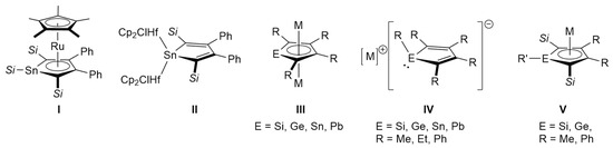Heavier congeners of cyclopentadienyl anions, known as metallolyl anions and dianions with general formulas of [C4R5E]− and [C4R4E]2− (E = Si, Ge, Sn, Pb), respectively, have attracted continuous attention as novel ligands in coordination chemistry and unconventional aromatic systems consisting of heavier group 14 elements [1,2,3,4]. Following the seminal works by Tilley on the coordination chemistry of silolyl/germolyl anions and dianions [5,6,7,8,9,10], several groups have contributed to the development of this field. Various transition metal complexes incorporating metallolyl ligands have been reported, exhibiting diverse coordination modes such as μ-η5:η5- [11,12], η5- (I in Figure 1) [13], μ-η1:η1- (II) [14,15], μ-η1:η5- [16], η1- [17], and η4-like fashions [13,18]. Recently, the coordination chemistry of metallolyl dianions towards rare-earth elements and f-block metals has also been investigated [19,20,21,22]. These studies have shown that η5-coordinating metallolyl anions and dianions are aromatic with almost equal C–C bonds in the five-membered ring, whereas η1- and η4-coordinating ones are nonaromatic with a 1,3-diene character [14]. Therefore, coordinating modes have a significant impact on the electronic structure of metallolyl anions and dianions.