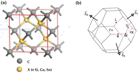 (a) The lattice structure of novel zinc-blende (zb) XC binary materials. The yellow color circles are represented for X (≡Si, Ge and Sn) atoms, while the grey color circles symbolize C atoms arranged in the tetrahedral ( point group symmetry. (b) The Brillouin zone of face-centered cubic material is labeled with high symmetry points (see: text).