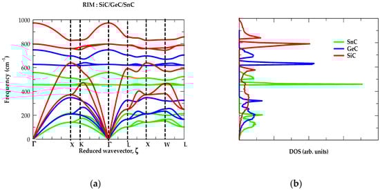 From a theoretical standpoint, several calculations are performed to understand the structural, electronic, and optical properties of the binary compounds using full potential linear augmented plane wave (FP-LAPW), first-principles (ab initio) and molecular dynamical (MD) methods [,,,,,,,,,,,,,,,,,,]. For the ternary XxY1−xC alloys, however, no systematic studies are known for comprehending their lattice dynamical and/or thermodynamic characteristics. To accomplish major technological applications of the C-based heterostructures [e.g., Si/Si(Ge)C, GeSnC/GeC MQWs and (SiC)m/(Ge(Sn)C)n SLs], such calculations are necessary to obtain the complete phonon dispersions of XC and XxY1−xC materials from realistic lattice dynamical models. One reason for this requisite is that the dynamical response of polar lattices affects the key electronic properties, including the exciton-binding energies and charge-carrier mobilities. Examining the dynamical response of crystals and its impact on the dielectric environment provides a major step in realizing their structural characteristics. The other reason for its need is that, in MQWs and SLs, the phonon density of states (DOS) of binary/ternary alloys has played crucial roles in evaluating thermodynamic traits, including the thermal expansion coefficients α(T), Debye temperature ΘD(T), heat capacity Cv(T), Grüneisen constants γ(T), entropy, lattice thermal conductivity, etc.
