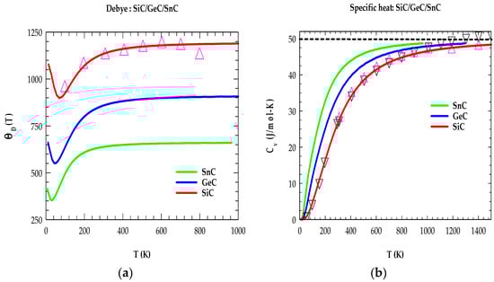 At a single temperature T, the outcomes of our results (cf. Figure 3a,b) for [] have shown considerable decrease [increase] in the simulated values with the increase of cation X atomic masses (i.e., from Si → Ge → Sn). Again, at low T, our results of for the binary materials have not only confirmed the correct trends with appropriate shapes replicating the T3 law but also provided a reasonably good match with the existing experimental/theoretical data [,,,,]. For 3C-SiC, the experimental values of specific heat at constant volume () [] and constant pressure ( [] are included in Figure 3b using different colored symbols. As expected, the results of for XC binary materials at highest temperatures approached ~50 (J/mol-K) [see (Figure 3b)], in excellent agreement with the Dulong–Petit rule. Clearly, these results are justified because at higher T, one would anticipate all the excited phonon modes contributing to the thermodynamic characteristics.
