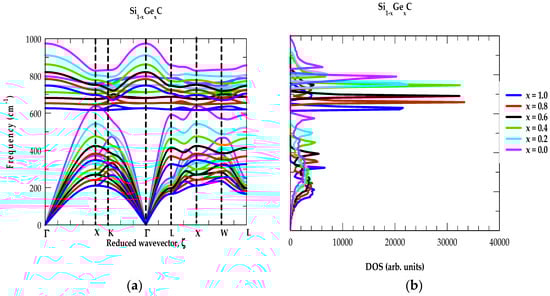 In the framework of a generalized RIM GF formalism (cf. Section 2.2), systematic simulations are performed for predicting the results of x-dependent phonon dispersions and DOS, for the ideal mixed X1−xYxC ternary alloys. For instance, the calculated results of Si1−xGexC alloys displayed in Figure 4a,b have clearly validated that the values of and steadily shifting towards the lower frequency regions as x increases (i.e., from ≡0.0, 0.2, 0.4, 0.6, 0.8 and 1.0). Moreover, in the extreme situations x → 0.0, and x → 1.0, the results are seen transforming to those of the binary SiC and GeC materials.