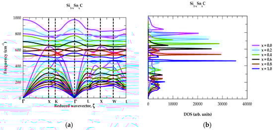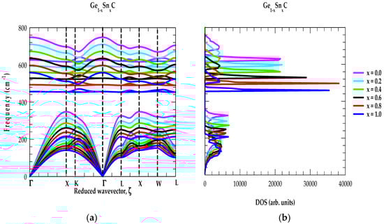 From the phonon characteristics of Si1−xGexC alloys (cf. Figure 4a,b), we have also noticed a few interesting features: (a) the x-dependent curves of exhibit very similar traits, (b) the modes show nearly flat dispersions in the X → Γ → L directions which are responsible for triggering appropriate strong peaks in the , (c) the modes have demonstrated almost flat dispersions in the L → X → W directions which initiated the correct weak peaks in the , and (d) the splitting of optical phonon modes ( − ) decreased from 177 cm−1 → 161 cm−1 → 149 cm−1 → 139 cm−1 → 130 cm−1 → 123 cm−1 with the increase of composition, x (0.0 → 0.2 → 0.4 → 0.6 → 0.8 → 1.0). Very similar phonon characteristics are also noticed in the Si1−xSnxC (cf. Figure 5a,b) and Ge1−xSnxC (cf. Figure 6a,b) ternary alloys.