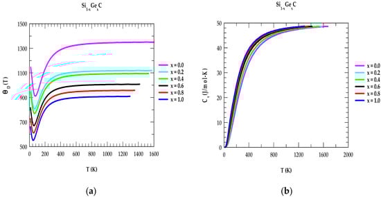 (a) Composition-dependent rigid-ion model calculations of Debye temperatures ΘD(T) for Si1−xGexC with x = 0.0, 0.2, 0.4, 0.6, 0.8, and 1.0. (b) Composition-dependent RIM calculations of one specific heat for Si1−xGexC with x = 0.0, 0.2, 0.4, 0.6, 0.8, and 1.0.