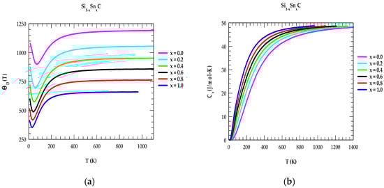 (a) Composition-dependent rigid-ion model calculations of Debye temperatures ΘD(T) for Si1−xSnxC with x = 0.0, 0.2, 0.4, 0.6, 0.8, and 1.0. (b) Composition-dependent RIM calculations of one specific heat for Si1−xSnxC with x = 0.0, 0.2, 0.4, 0.6, 0.8, and 1.0.