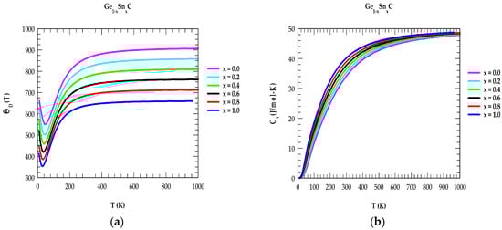 (a) Composition-dependent rigid-ion model calculations of Debye temperatures ΘD(T) for Ge1−xSnxC with x = 0.0, 0.2, 0.4, 0.6, 0.8, and 1.0. (b) Composition-dependent RIM calculations of one specific heat for Ge1−xSnxC with x = 0.0, 0.2, 0.4, 0.6, 0.8, and 1.0.