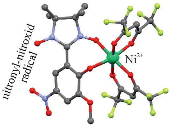 A magnetic core of the nickel-radical molecular complex (Et3NH)[Ni(hfac)2L], visualized according to crystallographic data deposited at Cambridge Crystallographic Data Centre from reference [37]. The used abbreviations: HL = 2-(2-hydroxy-3-methoxy-5-nitrophenyl)-4,4,5,5-tetramethyl-4,5-dihydro-1H-imidazol-3-oxide-1-oxyl and hfacH = hexafluoroacetylacetone.