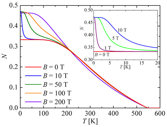 Next, let us investigate the strength of bipartite thermal entanglement in the molecular complex (Et3NH)[Ni(hfac)2L] at nonzero temperatures. Typical temperature dependencies of the negativity of the mixed spin-(,1) Heisenberg dimer with the parameter set K, , and adjusted to a theoretical modeling of the molecular compound (Et3NH)[Ni(hfac)2L], are depicted in Figure 2 for a few selected values of the external magnetic field. In agreement with the previous ground-state analysis, the negativity starts at zero magnetic field from the zero-temperature asymptotic value , and then it shows a gradual temperature-induced decline until the negativity completely vanishes at the threshold temperature K. Contrary to this, it is evident from Figure 2 and its inset that the negativity starts at relatively small magnetic fields ( T) from the higher zero-temperature asymptotic value , in accordance with the previous arguments concerning with the magnetic field-driven enhancement of bipartite quantum entanglement. The negativity at relatively small magnetic fields subsequently shows a sudden drop upon increasing temperature until it tends towards the respective zero-field value before the negativity finally displays a gradual temperature-induced decline, terminating at the same threshold temperature, K, as the zero-field case. Note that the initial thermally driven reduction of the negativity is steeper, the smaller the external magnetic field is, whereas this phenomenon gradually vanishes at higher magnetic fields. A detectable reduction of the zero-temperature value of the negativity due to the external magnetic field occurs merely at extremely high magnetic fields, T.
