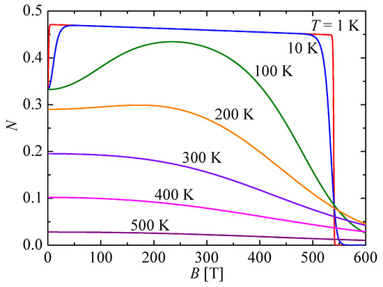 Furthermore, a few typical isothermal dependencies of the negativity on a magnetic field are plotted in Figure 3 for the mixed spin-(,1) Heisenberg dimer with the parameter set K, , and adjusted to a theoretical modeling of the molecular compound (Et3NH)[Ni(hfac)2L]. At low-enough temperatures, K, the negativity shows an abrupt magnetic field-induced rise from the zero-field value towards the much higher value , which is subsequently followed by a gradual quasi-linear decrease achieved upon further strengthening of the magnetic field until the negativity suddenly drops down to zero at the extremely high magnetic field T. While a small magnetic field significantly strengthens the thermal entanglement by roughly 41% due to the Zeeman splitting of the ferrimagnetic ground-state doublet, the subsequent reduction of thermal entanglement observable upon further increase of the magnetic field is quite negligible. Namely, the magnetic field change of 500 T decreases the negativity only by approximately 2%. It is noteworthy that the unconventional magnetic field-driven strengthening of thermal entanglement is gradually suppressed upon increasing temperature, as exemplified by the isothermal dependencies of the negativity calculated at temperatures of K and 200 K. At and above room temperature, the negativity displays a conventional monotonous decrease upon increasing the magnetic field, whereby the strength of thermal entanglement is kept almost constant in the magnetic field range T, effective for technological applications. From this perspective, it is worthwhile to remark that the strength of the bipartite entanglement of the molecular compound (Et3NH)[Ni(hfac)2L] at room temperature acquires roughly 40% of its maximum value, corresponding to the fully entangled Bell states, independently of the magnetic field strengths accessible for contemporary real-world technologies ( T).