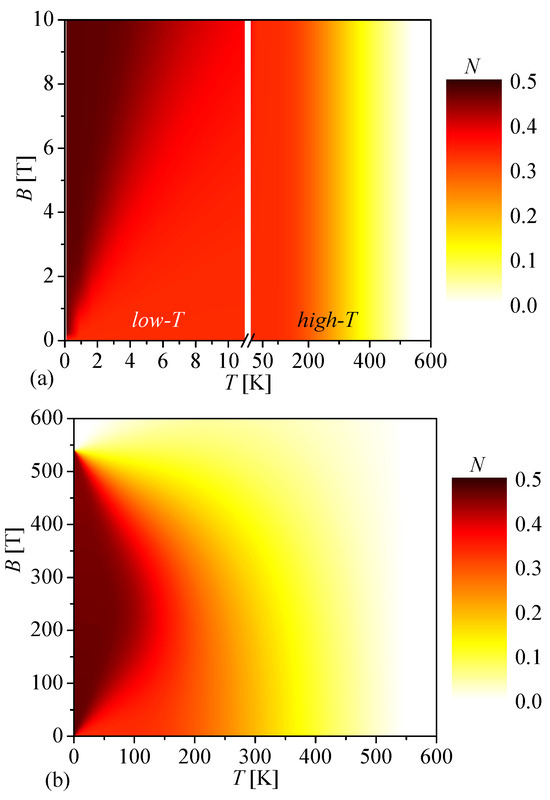 Finally, let us conclude our discussion with a detailed analysis of a density plot of the negativity in the temperature versus magnetic field plane, which was obtained for the mixed spin-(,1) Heisenberg dimer with the parameter set K, , adjusted for a theoretical modeling of the molecular complex (Et3NH)[Ni(hfac)2L]. Figure 4a shows a detail of the relevant density plot up to the magnetic field T, which represents a typical upper limit of the magnetic field strength for commercially accessible devices generating static magnetic fields. It is obvious from a low-temperature part of the density plot that this magnetic field range is capable of stabilizing an almost perfect bipartite entanglement of , which nearly approaches fully entangled Bell states, only up to a temperature of K. In fact, the rise in temperature necessitates a stronger magnetic field to restore almost perfect bipartite entanglement, as reflected by a relatively steep gradient of the dark region in the given density plot. The color shading with the character of vertical stripes observed in a high-temperature part of the density plot ( K) contrarily verifies the independence of the strength of bipartite thermal entanglement on the magnetic field in the range of sufficiently small magnetic fields, T. Although the strengthening of bipartite thermal entanglement due to the Zeeman effect cannot be utilized in the high-temperature region, the increasing magnetic field does not diminish the strength of bipartite thermal entanglement either. For completeness, the density plot of the negativity in a full range of temperatures and magnetic fields is plotted in Figure 4b in order to provide the phase diagram, which delimits a parameter region with nonzero thermal entanglement. The displayed phase diagram convincingly evidences that the molecular compound (Et3NH)[Ni(hfac)2L] exhibits thermal entanglement, which is confined to temperatures below 540 K and magnetic fields below 540 T. The respective limit set for temperature evidently implies a possible implementation of the nickel-radical molecular complex (Et3NH)[Ni(hfac)2L] for room-temperature technological applications, exploiting the intense thermal entanglement for quantum computation and quantum information processing.